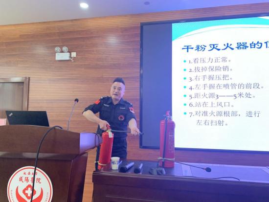 此次培訓(xùn)邀請(qǐng)保衛(wèi)科寇東亮副部長(zhǎng)進(jìn)行授課,寇部長(zhǎng)從消防基礎(chǔ)知識(shí)、消防設(shè)施器材使用、撲救火災(zāi)的處置程序措施、消防安全隱患及防范措施等各個(gè)方面給大家做了生動(dòng)形象的講解及演示,結(jié)合國(guó)內(nèi)火災(zāi)案例,強(qiáng)調(diào)醫(yī)院作為人員密集場(chǎng)所,應(yīng)提高院內(nèi)職工、學(xué)生的消防安全意識(shí)和應(yīng)急處置能力。并詳細(xì)介紹了滅火器的用途、性能、原理,在現(xiàn)場(chǎng)展示了滅火器操作方法,讓在場(chǎng)的新員工、同學(xué)們明確了消防安全的重要性。