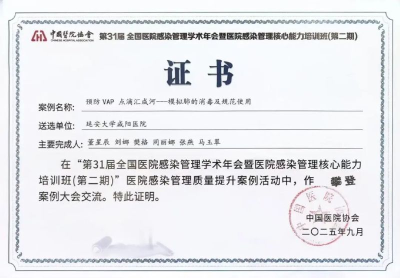 在2025年9月4日至8日于福建福州召開的第31屆全國醫(yī)院感染管理學(xué)術(shù)年會上,我院感控團(tuán)隊?wèi){借《預(yù)防VAP點滴匯成河—模擬肺的消毒及規(guī)范使用》案例,從全國400余個參賽項目中脫穎而出,在大會匯報交流,被評為“攀登案例”。
