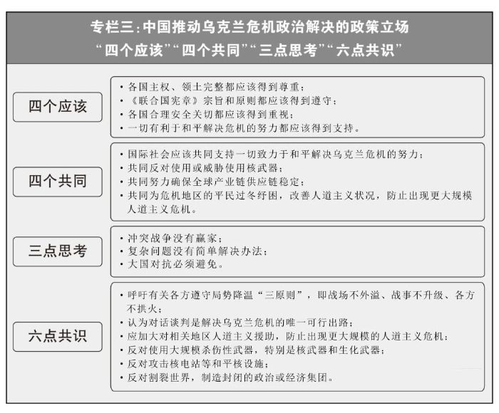 在烏克蘭問題上,恪守客觀公正,積極勸和促談,提出“四個應(yīng)該”、“四個共同”、“三點思考”,發(fā)布《關(guān)于政治解決烏克蘭危機的中國立場》,同巴西聯(lián)合發(fā)布“六點共識”,會同“全球南方”國家發(fā)起“和平之友”小組,堅決維護“核戰(zhàn)爭打不贏也打不得”共識,積極推動落實《五個核武器國家領(lǐng)導(dǎo)人關(guān)于防止核戰(zhàn)爭與避免軍備競賽的聯(lián)合聲明》,為防止烏克蘭危機升級為核沖突發(fā)揮重要作用。中方支持一切致力于和平的努力,同時認為所有當(dāng)事方和利益攸關(guān)方都應(yīng)適時參與到和談進程中。