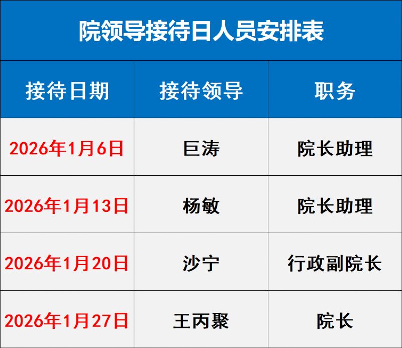 為進(jìn)一步提升醫(yī)療質(zhì)量、醫(yī)療安全和服務(wù)效率,不斷改善群眾看病就醫(yī)體驗(yàn),我院特設(shè)立 “院領(lǐng)導(dǎo)接待日”,院領(lǐng)導(dǎo)面對(duì)面接待群眾來(lái)訪,現(xiàn)場(chǎng)答疑解惑,切實(shí)落實(shí) “醫(yī)院領(lǐng)導(dǎo)要把職工的利益放在第一位,全院職工要把患者的需求放在第一位” 的核心要求,現(xiàn)將2026年1月醫(yī)院“院領(lǐng)導(dǎo)接待日”安排公示如下: